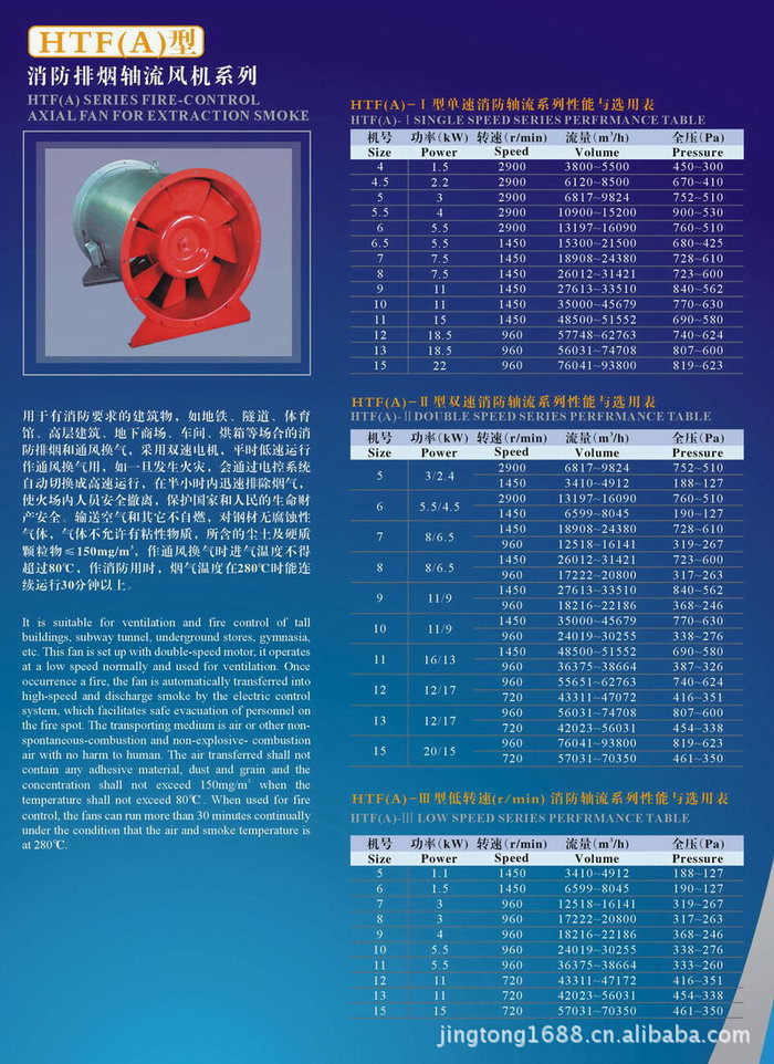 HTF 系列消防排烟风机是为满足高层民用建筑的消防排烟而专门设计、制造的系列风机产品,经国家固定灭火系统和耐火构件质量监督检验中心检查合格,证明该系列风机能在280℃的高温条件下安全运行30 分钟以上,气体温度≤120℃时可长期使用。HTF 系列消防轴流排烟风机配置高速电机作为消防排烟的专用风机:若配置双速电机则平时低速运行,作为空调的配套设备或通风换气之用:一旦发生火灾,则自动控制系统动作,风机转入高速运行,达到消防排烟的目的,使或者区域内的人员能及时安全撤离。