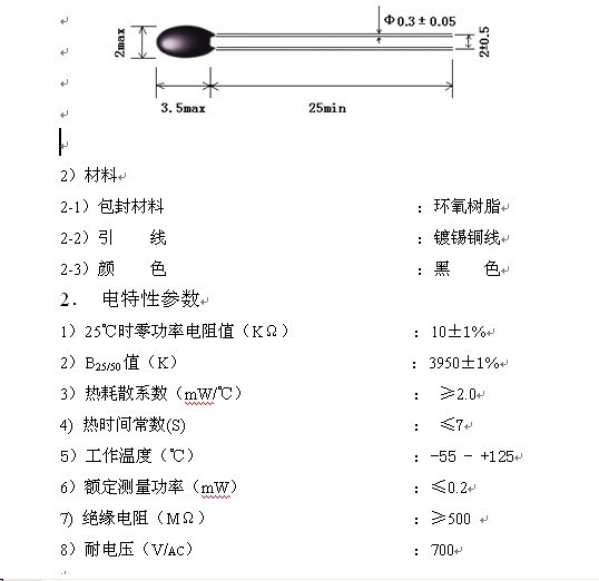 [ 产品介绍 ] 负温度系数热敏电阻主要技术参数 型号:MF52 A1103 F 3950 一般参数 1)尺寸(mm)
