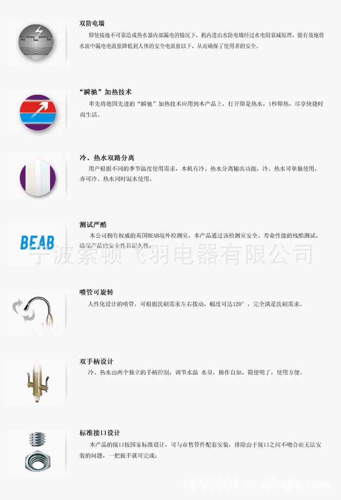 3、零火线正确连接技术:即使前两种保护失效,出水电压也为“0”,重重防电壁垒为安全把关(最新专利技术)。