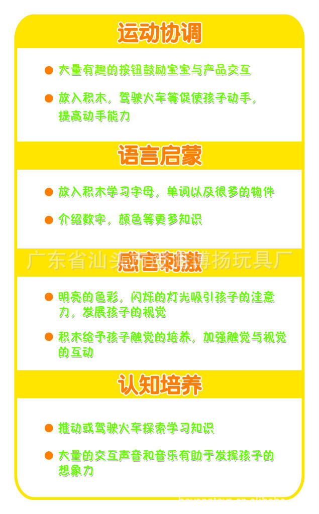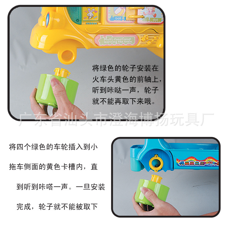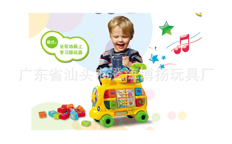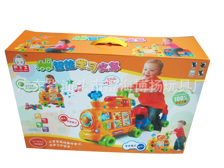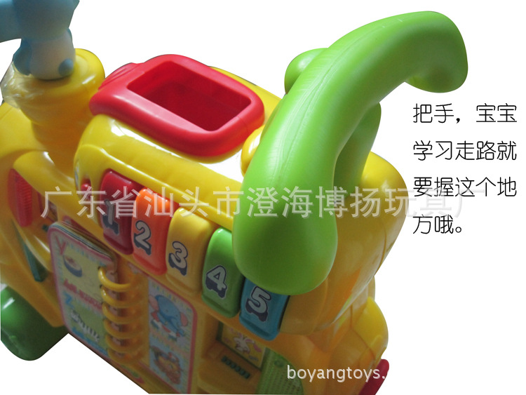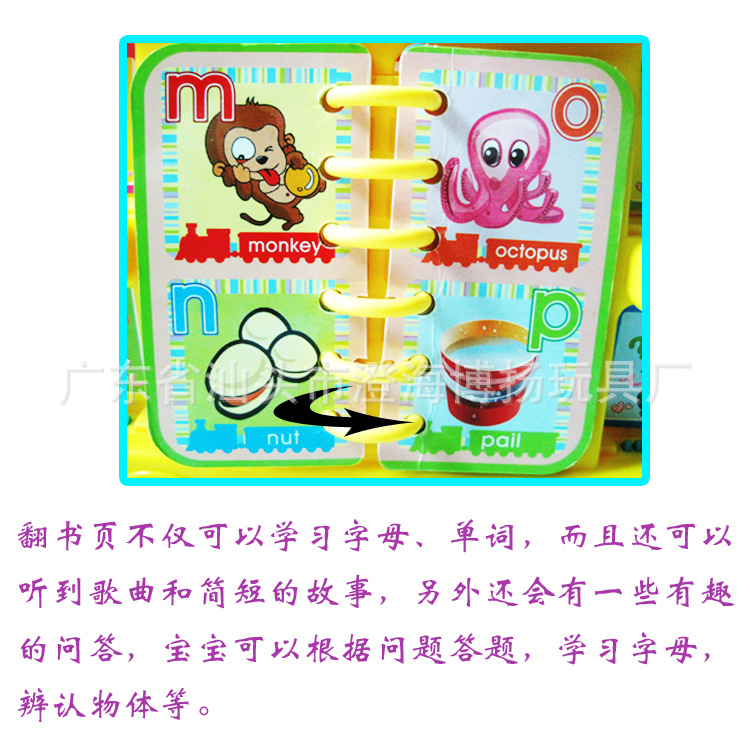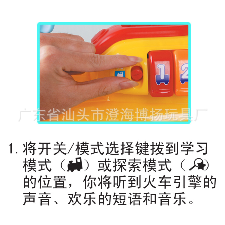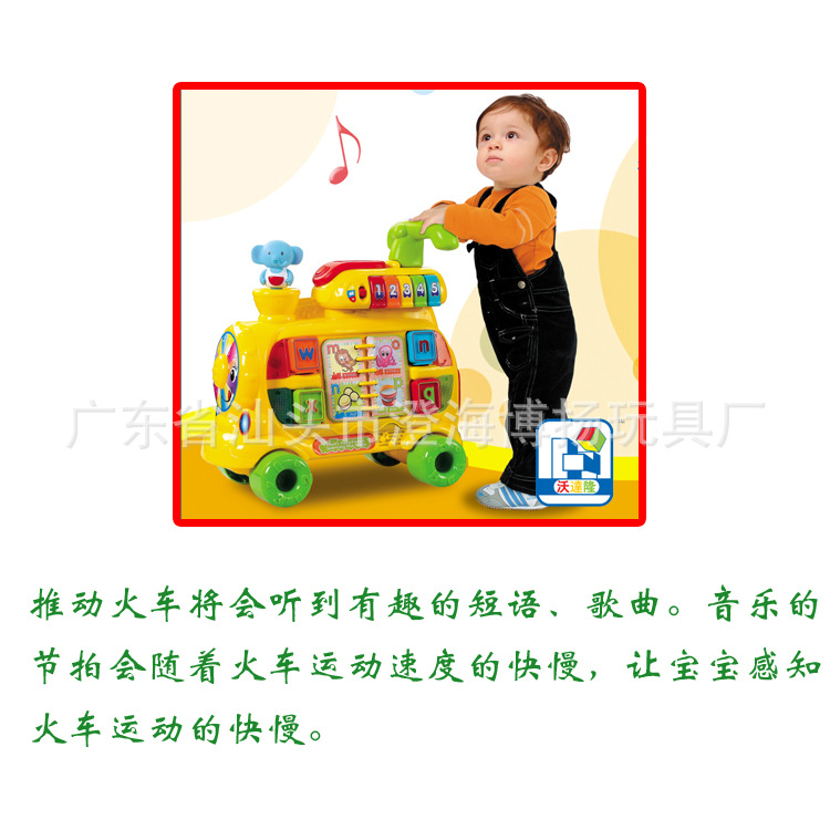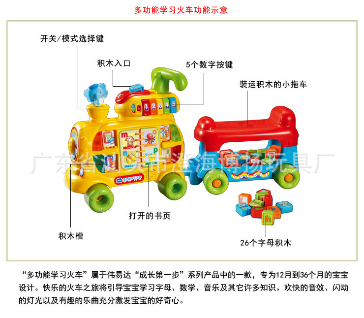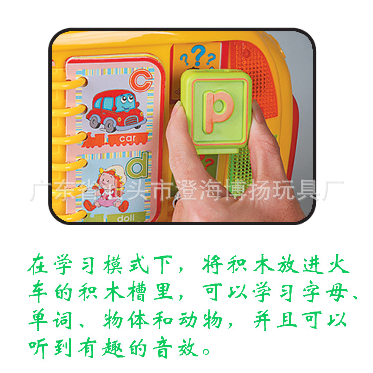 “智能学习火车”是帮助宝宝成长的得力助手!小朋友可以通过这款小火车认识字母、单词,识别颜色及辨认物体,并且还能听到优美的歌曲。“智能学习火车”包括了26个字母积木,一本有6页可翻看的书,5个色彩丰富的数字按钮,一个可按压的大象造型,1个感应器,一个可坐在上面的积木拖车,积木拖车有很大的空间可以托运玩具,放置那些字母积木。小朋友可以坐在地板上跟着“智能学习火车”学习知识,还可以推着它边走边学习,或者连上拖车当一个小司机哦!“智能学习火车”为宝宝在起跑线上加油!