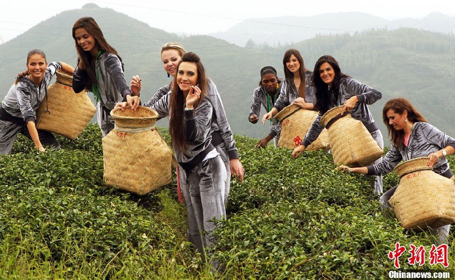 9月30日,2013环球比基尼小姐全球总决赛在福建大田举行赛事活动,参赛佳丽来到高山茶场体验采茶情趣。