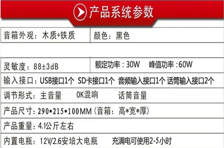 特别适用于门店、门市促销播放广告、商场、超市促销、户外演出、户外娱乐,广场晨练、教学讲座、论坛、会议、户外舞蹈等等........功能强大,一机多用,适用广范,您值得拥有!