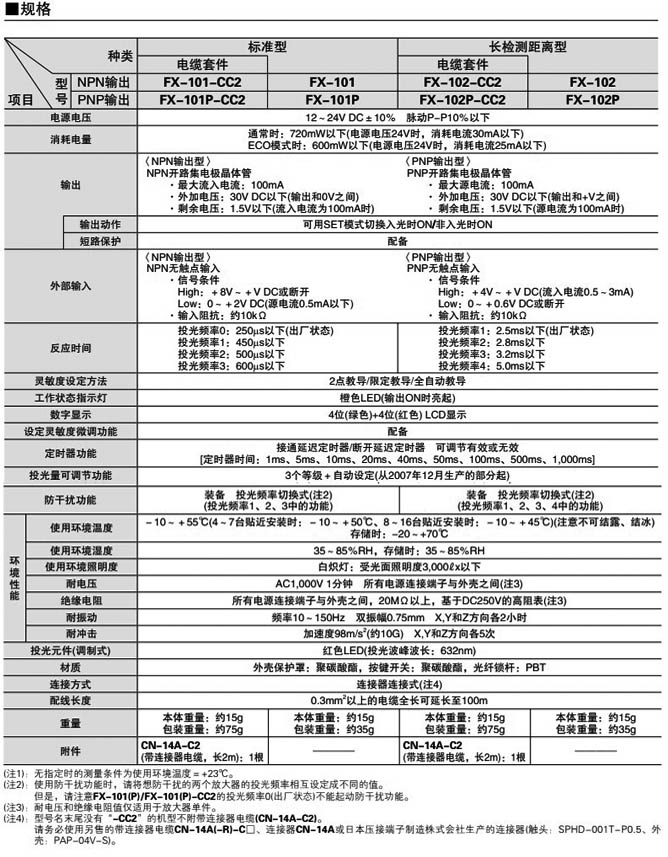 种类 | 形状 | 型号 | 投光 元件 | 输出 | 标准型 | 电缆套件(注1) |  | FX-101-CC2 | 红色LED | NPN开路集电极晶体管 | FX-101P-CC2 | PNP开路集电极晶体管 | FX-101(注2) | NPN开路集电极晶体管 | FX-101P(注2) | PNP开路集电极晶体管 | 长检测距离型 | 电缆套件(注1)