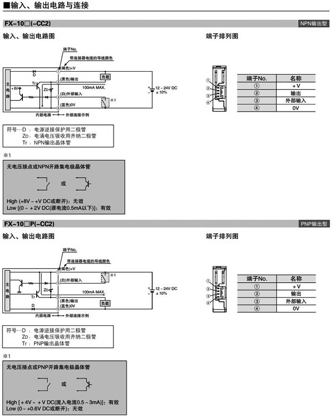 | FX-102-CC2 | NPN开路集电极晶体管 | FX-102P-CC2 | PNP开路集电极晶体管 | FX-102(注2) | NPN开路集电极晶体管 | FX-102P(注2) | PNP开路集电极晶体管 |