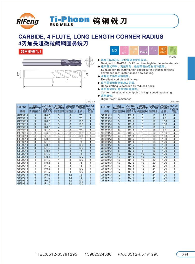 苏州日峰数控刀具为韩国YG钨钢铣刀的华东区总代理。有超微粒和极细超微粒两种,分别可加工HRC50度以下和HRC60度以下,适合普通铣床和数控加工中心,适用于普通钢,模具钢,淬火钢,铸铁,不锈钢,铜,铝,钛合金,镍合金等,用途广范。所有母材均为德国进口,德国ALTICN涂层技术,韩国磨制,质量稳定,耐磨性好,性价比极高。规格齐全,货源充足,可接受非标定制,欢迎来电或来我司莅临指导。薛峰:65791295,13962524580