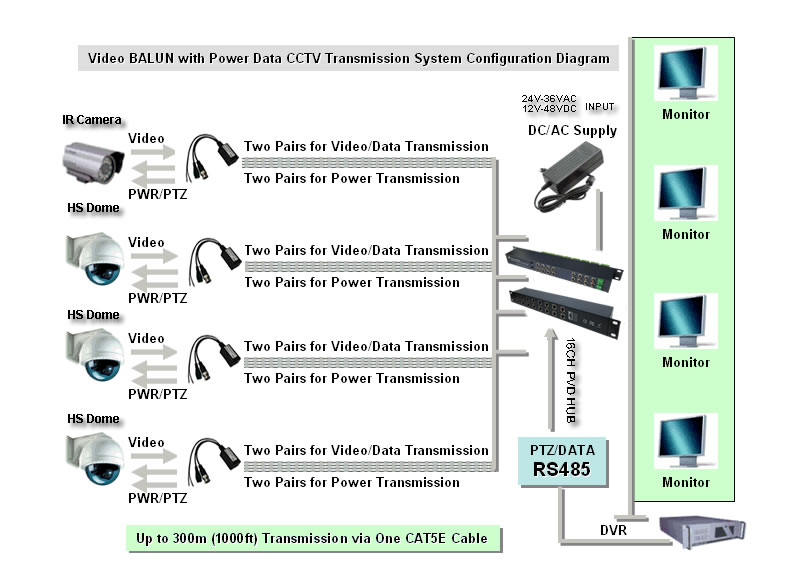 | HT9011VPD-F 与HT9016PVD CCTV闭路电视监控系统双绞线传输示意图 |