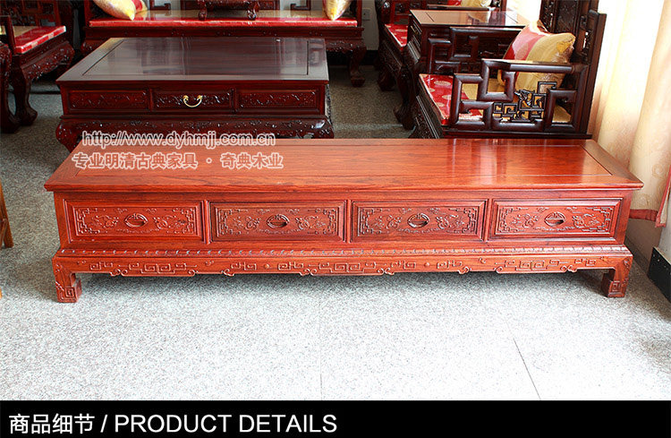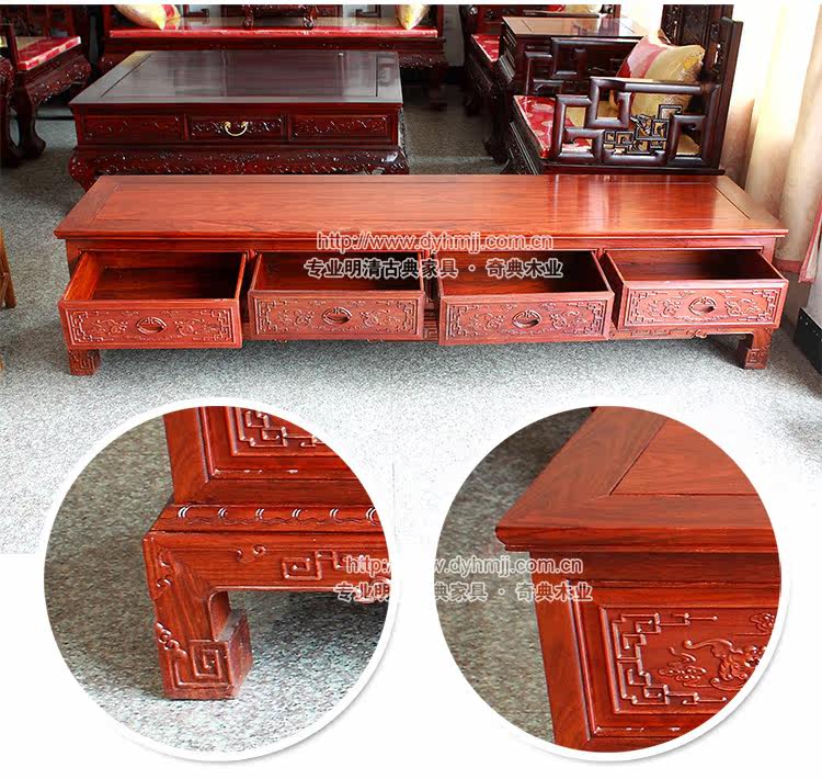 | 品牌名 | 卓匠 | 宝贝名称 | 非洲黄花梨木电视雕花柜 | | 生产周期 | 5-25天,具体详情咨询在线客服! | 运输方式 | 物流运输 | | 产品产地 | 浙江东阳 | 保修期 | 一年 | | 风格 | 明清古典 | 包装方式 | 汽泡膜+木架(另外加钱) | | 产品尺寸 | 长200cm*宽50cm*高41厘米 | | 家具颜色说明 | 花梨本色,也可按照自己的要求定颜色 | | 保养说明 | 要避免潮湿,远离灶炉,要与酸、碱等化工试剂隔绝,防止腐蚀变质 | | 运费问题 | 网页上的标注运费并非真实费用,具体运费详情请咨询客服 | | 材质说明 | 非洲花梨木材本身条纹和交错纹理构成美丽花纹,木质坚硬耐久性强是名贵的深色木材。 |