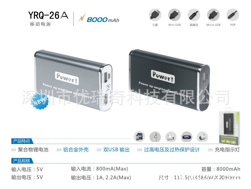 随着社会的不断进步,数码产品的迅猛发展,功能日益强大。但,随之而来的就是电池的消耗增大,一般的随机电池都会因容量低而不有满足设备的正常使用,这时,拥有一款像YRQ-26A这样有着强大容量和兼容性的移动电源就能解决您的后顾之忧,使您的工作学习都轻松自如,随心所欲。