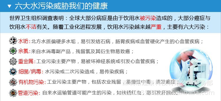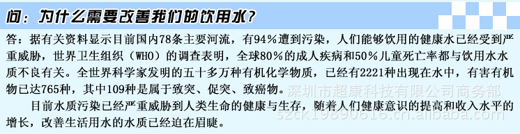 环境污染日益加剧,各种有机化合物通过各种不同的途径进入了人类环境特别是水环境。同时,由于自来水厂传统给水工艺和给水管网本身存在的实际问题,导致城市自来水的现状是:感官质量差、有机物含量高、常常具有致突变性。导致人们患慢性、肿瘤疾病日渐增多。烧开水时壶面、壶低常有白,灰等色结垢或沉淀。人们常饮此水易得心脏病,脑血管合肾结石等疾病。好茶叶品不出美味,变得淡而苦涩。有时井水还出现有毒金属汞、镉、砷等,自来水厂工艺亦无法解决,需进行深度处理得。