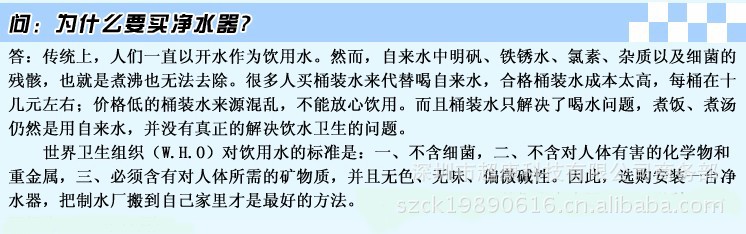 按需使用不同滤芯的滤水器处理过的水能解决各种问题,制造出安全且美味的水。让全家不管是刷牙,洗脸,还是洗澡,洗衣都可以用上高质量的净化水,不再让自来水中污质来侵害本来娇嫩的肌肤,特别是家里的女人,孩子们。就算您使用最贵的化妆品,而没有干净的水来冲洗那还是一切都白搭的。