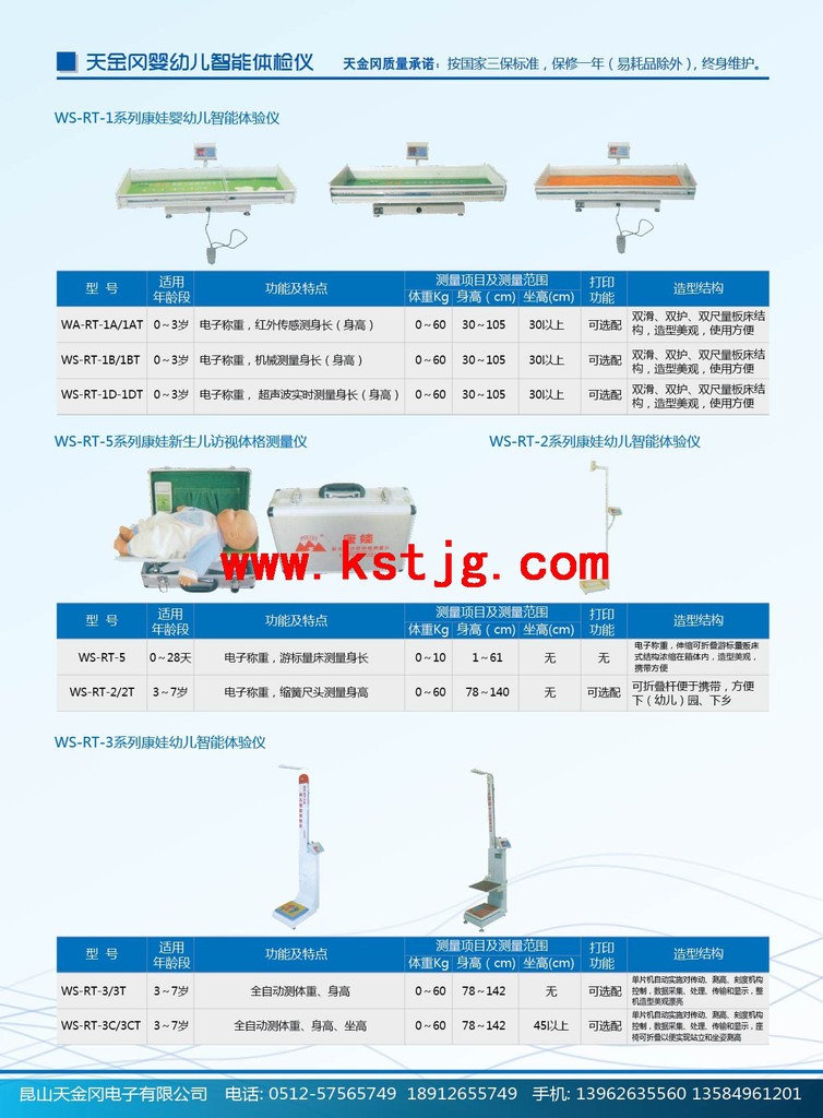 【产品名称】 “康娃”婴幼儿智能体检仪(新型) 【产品型号】 WS-RT-1B 【产品用途】 主要用于婴幼儿生长发育体格检测,适用单位:医院、妇幼保健院、社区卫生服务中心(站)、乡镇卫生院等。 【产品简介】 测量0-3岁婴幼儿,体重在0-50KG,身长在30-100CM。全中文菜单操作,可自动测量体重,手动测量身长、头围、胸围,输入性别、出生年月,按WHO或九市标准可精确计算并显示身长、体重、头围、胸围及营养评价值和正常中位数。