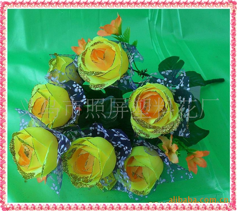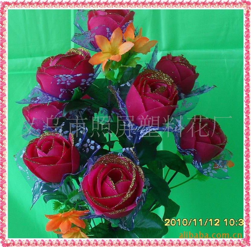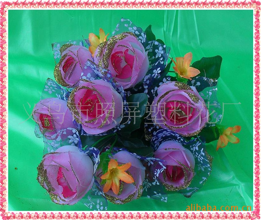 规格;高 38厘米,花头直径6 厘米,10头枝干。沾金粉,有蓝纱。