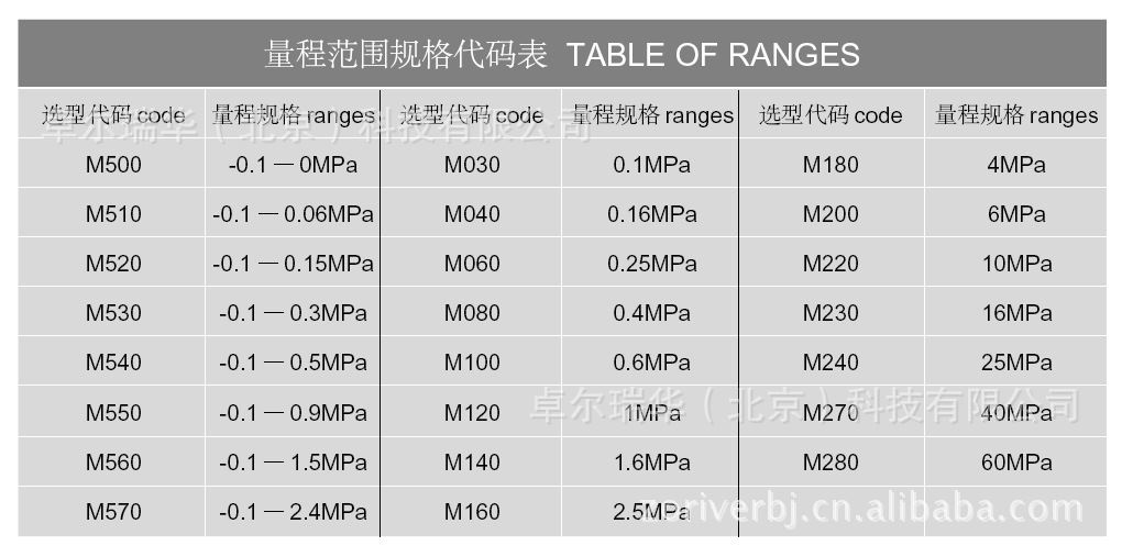 量程范围规格代码表 TABLE OF RANGES