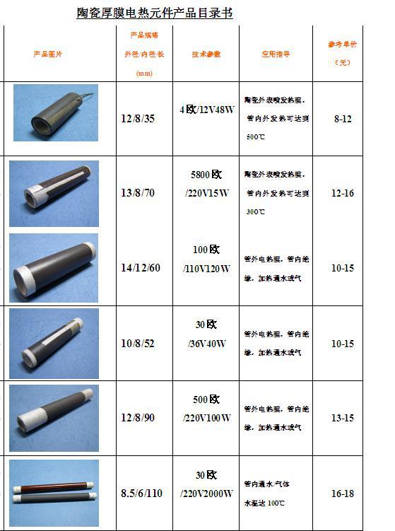 管外电热膜,管壁涂膜,高温共烧,膜附着力强,管内绝缘,加热通水或气.使用寿命长、耐高温陶瓷管,抗骤冷骤热,耐压达6kg/cm2, 流量2.5∽3L/min;绝缘电压及泄露电流按国家标准控制,实现水电分离的最佳效果:即开即热,热响应时间短,热转换率高,节能方便;耐酸碱,耐腐蚀,无水垢,环保健康;应用:汽车加热器、除冰器、鱼缸加热、桑拿浴房、理疗仪、温水器、即热式热水器、速热龙头、开水炉、蒸气发电器等管状发热元件!