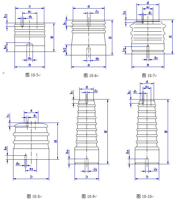 Z——户内外胶装支柱绝缘子; ZN——户内内胶装支柱绝缘子; ZL——户内联合胶装支柱绝缘子; 对于外胶装支柱绝缘子,破折号前字母L表示多棱式,字母A、B、D表示机械破坏负荷分别为3.75,7. 5,20kN。字母后分数,分子表示额定电压千伏数,分母为机械破坏负荷kN数。 N——内胶装上下附件为单螺孔者; Y——外胶装和联合胶装下附件为圆形者; T——外胶装下附件为椭圆形者; F——外胶装下附件为方形者; G——高原型(老产品为GY)