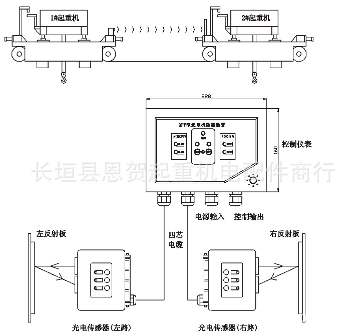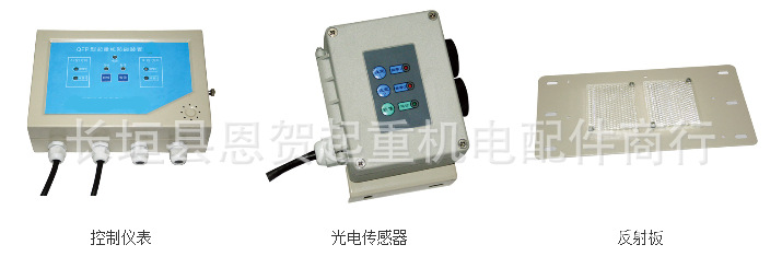 型号规格说明:"QFP-Ⅰ(Ⅱ)-A(B)" 起重机防碰装置。其中QFP表示产品型号,Ⅰ表示单向(1路传感器),Ⅱ表示双向(2路传感器),A表示单控(设定一个距离),B表示双控(设定两个距离)。