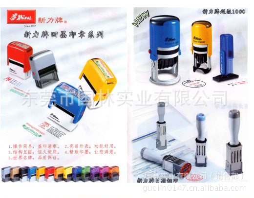 台湾shiny新力旗下款式多种,分别有:轻型回墨印,重型回墨印,随身印章,光敏印章,字粒回墨套印,回墨日期印,日期钢印,日期章,号码章,数字章,转动印章,回墨印油,光敏印油,原子印油,水性油墨,新力印台,毛毡印台,海绵印台,防伪指纹印台等等。
