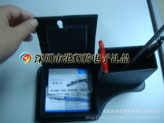 右边为笔筒功能,可以放笔或剪刀等办公类小电子产品此为产品的背面实物图产品可送于亲友,送于客户,可做于促销礼品,商务礼品,办公电子礼品左边万年历的下面还可以放置名片或小便签本万年历可以打开将名片或便签本放进去些为产品的后面和底部