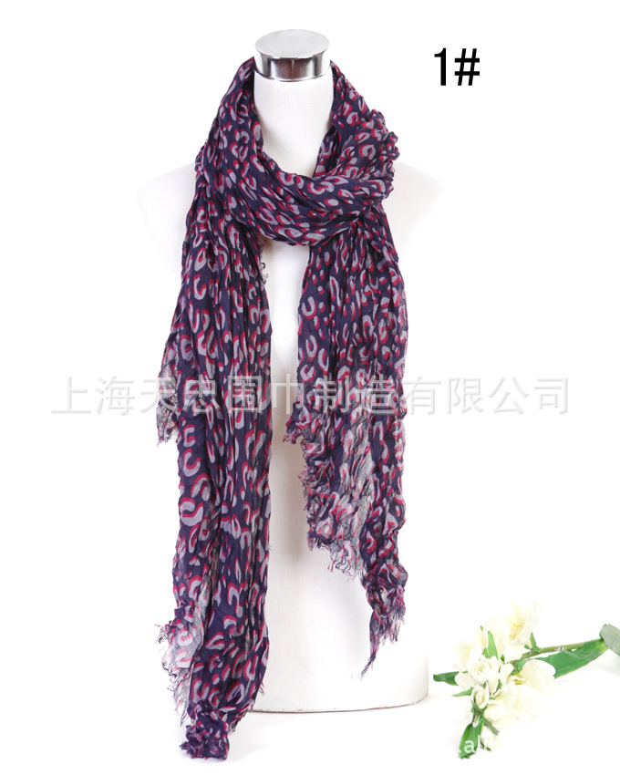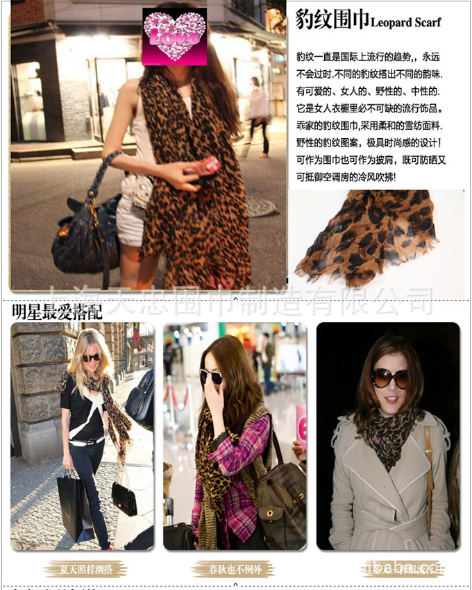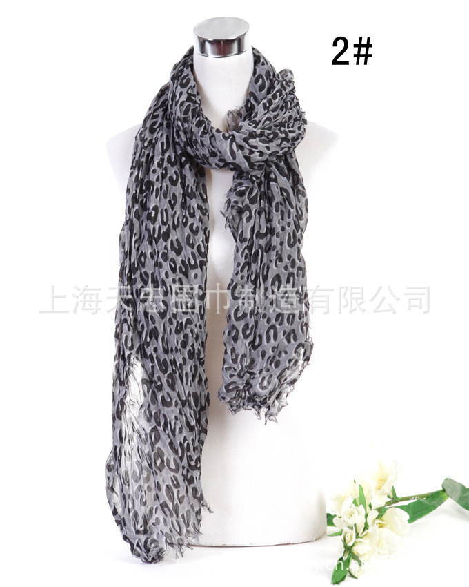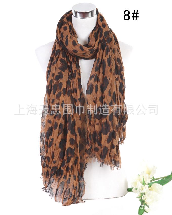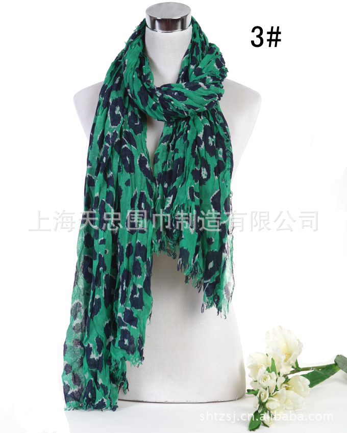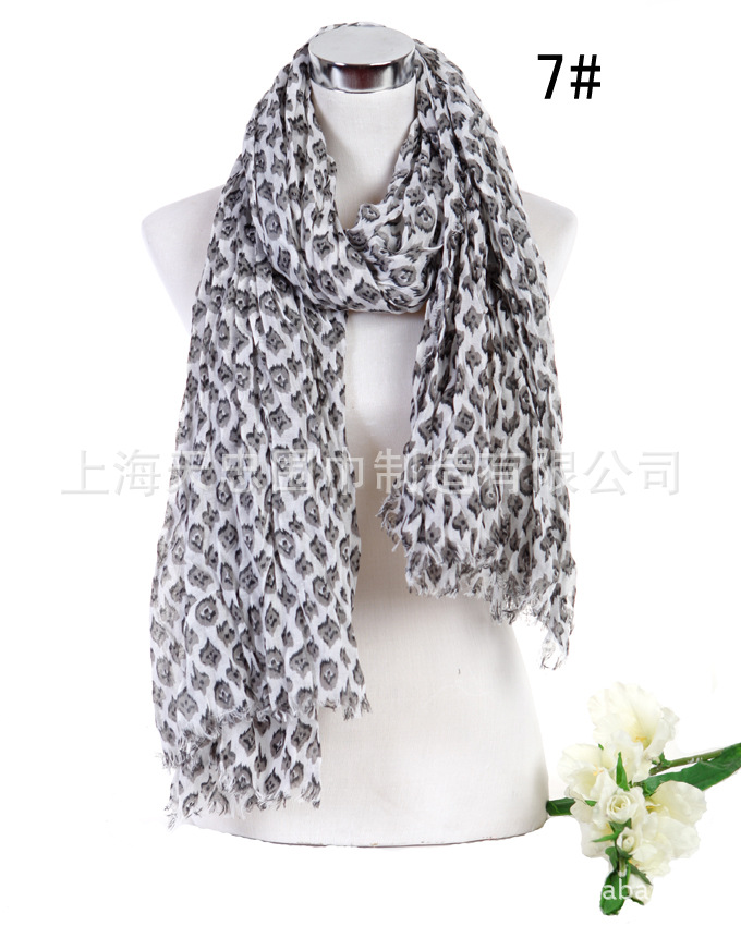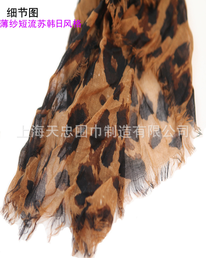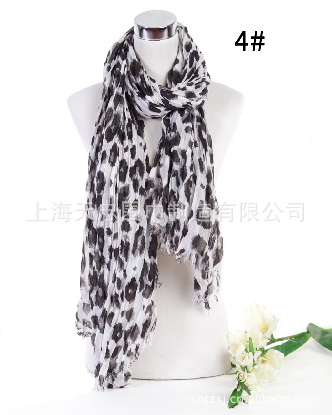 产品特色: 豹纹为国际时尚前沿一直采用的流行元素,永不过时。人棉的压皱工艺,不规则的流苏风行韩日潮流!!豹纹花型时尚百搭,是野性与灵性的融合,同时又是潮流与时尚的经典合体。在围巾花样层出不从的今天,豹纹围巾却一直存在。它是20-48岁女士最爱选择,穿上它,让你在人前一亮,让你别有一番味道,选择它,物超所值,你不会后悔的噢!