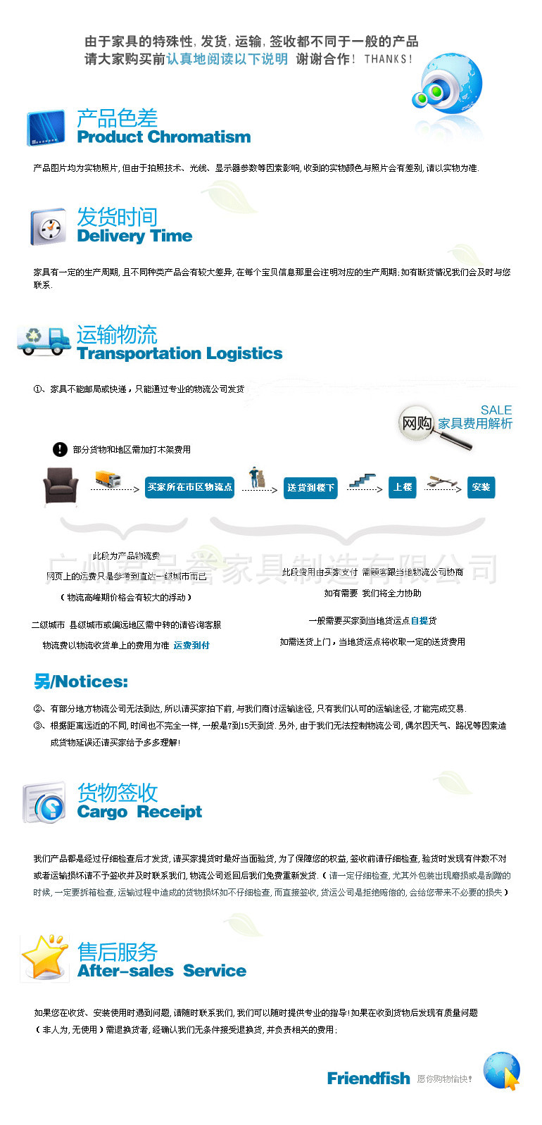 1、运费支付方式。一律采用到付的方式,运费由买家自己承担,物流与快递不一样,物流到付和提前付是一样的,因此没必要提前付,到付更安全快捷,这样如果出现问题就不会处于被动地位。 5、物流签收。收到货后,视外包装良好即可以签收产品;若包装有损,可重点检查包装损坏的部位,若货品没有损坏也可签收;如检货有损坏,请马上联系我们,我们共同处理;若包装没损坏,提回家后产品还是有问题,若是有少量掉漆等均属正常现象,您与我们直接联系确认后,我们将给您补发油漆,一般都可解决掉,若是家具某些部分损坏严重的话,我们会给您补件。