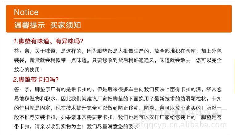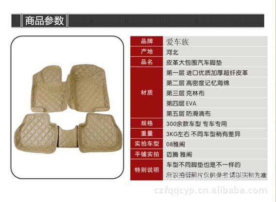 购买脚垫的朋友为您的爱车选择一 套高品质的脚垫.既可保持清洁.又能带来舒适脚感. 当然看上去还得有立体感.本店脚垫是高级环保皮革制成. 原厂模具.盆式脚垫.专业品质.无缝设计.有效的防止.沙.泥.血 .进入车内.底部防滑颗粒超级防滑.我店脚垫具有:1.耐磨.2易清洁.3隔音.4除尘.抗静电.谢绝议价.敬请谅解.亲们可直接拍下我们会在24小时内给您发货. 你的光临是我们的荣幸。您的满意是我们最大的愿望!新店开业,亏本销售。祝您购物愉快!