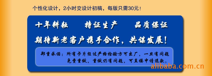 说明 | 1、以上报价包含小凸码烫金烫银、签名条、双面四色印刷,使用标准PVC材质。 2、以上报价不包含设计费用、运费、发票。 3、加金底银底、磁条、条码、小凸码以外烫金,每千张加30元。 4、以上报价不包含异形卡、透明卡、磨砂卡、金属卡等特殊工艺,通过电话、旺旺、QQ咨询。 5、普通PVC卡生产周期6-7个工作日,以定稿日期为准。 6、如需要设计多种版面,每种版面需要加收30元设计费。 |