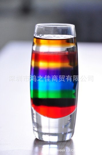 将酒按不同的密度缓慢倒入杯内,形成层次度.操作时注意:密度最大的酒放在下层,倒酒时要沿着杯壁缓慢到入.大家所熟悉的彩虹酒就是这样调出来的