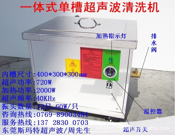 产品名称 | 超声波清洗机 | 产品型号 | SMART-40K720W | 电源电压 | 220V/AC±10% | 超声频率 | 40KHz | 超声功率 | 720W(采用进口高Q值高寿命陶瓷晶片换能器12只安装清洗槽底部,60W/只) | 加热功率 | 2000W(采用高寿命304#不锈钢发热管装于清洗槽内,加热快,寿命高,节能省电,电压220V/AC) | 内槽尺寸 | 400*300*300(mm)采用304#足2.20mm厚不锈钢板一次性冲压成型,经久耐用且防酸碱。(容量:36.0L) | 外型尺寸 | 550*450*600(mm)采用8K镜面1.0mm不锈钢板加工成型,外形非常美观。 | 工作时间 | 01-60分钟可调(倒计时工作控制超声波) | 工作温度 | 常温-100℃可调(自动恒温加热,控制清洗温度) | 使用方法 | 放入清洗液,接入电源,启动电源开关即可使用 | 包装说明 | 木箱包装 | 附加功能 | 配隔音盖一个,清洗篮一个(清洗篮网孔规格10*10mm)。 | 注意事项 | 槽内无水或无溶剂时,禁止通电开机,否则后果自负。 | 服务期限 | 免费保修12个月,终身维护。 | 服务电话 | 24小时服务热线:137 2830 0703/周先生 |