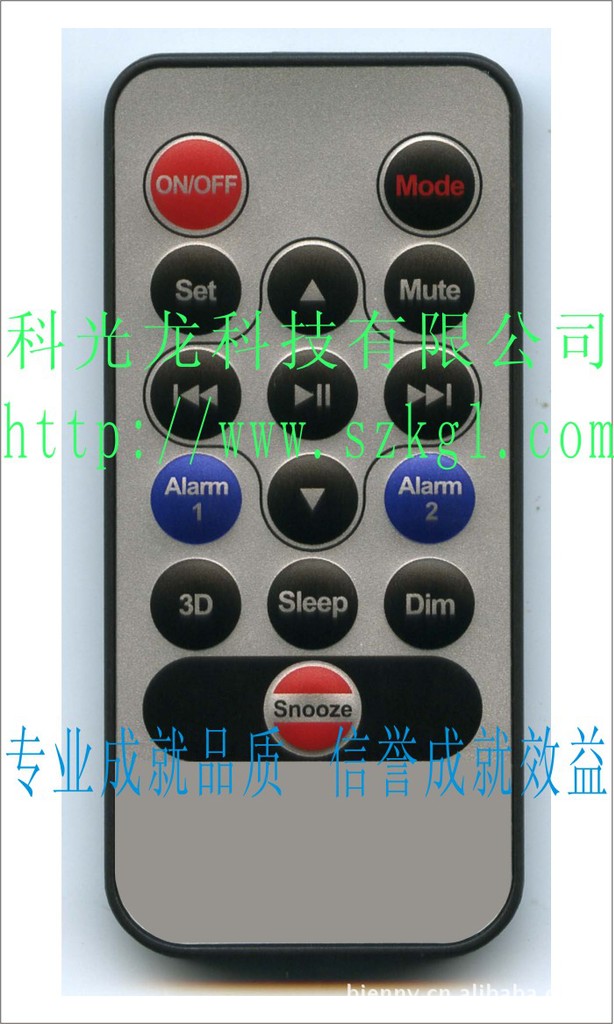 本公司是一家专业生产遥控器、红外线遥控器、环保遥控器、超薄遥控器、无线RF315兆、433兆遥控器、无线汽车遥控器、无线摩托车遥控器、无线家庭门禁遥控器、无线车库门锁控遥控器,无线灯具控制遥控器、导电胶遥控器、多款式鼓包遥控器、防水遥控器、车载方向盘遥控器、车载MP3\DVD遥控器、灯控遥控器、LED节能灯遥控器、足浴遥控器、足浴盆遥控器、门控安防遥控器、家用和便携式迷离音响遥控器、功放遥控器、空气净化器遥控器、空调遥控器、数码相框遥控器、电视盒、电视遥控器、硬盘播放器遥控器、电磁炉遥控器\DVD/DVB遥控器。本公司是一家具有为国内国外客户提供各种新款式遥控器图纸设计与模具制作为一体,以注塑成形、硅胶制造、喷油丝印、电子装贴片与邦定为基础,集开发、生产、贸易为一体的大型高科技企业。公司综合实力雄厚、配套设施完善、生产管理规范,在电子及配套材料行业中享有盛誉。 科光龙现有员工200-300多人,中、高级技术和管理人才占15%,利用人才和技术优势,全面推行7S管理模式,建立了科学高效的运作体系,奉行“以质量求生存,以信誉求发展”的质量方针。 展望未来,科光龙将继续秉承和发扬“敬业、诚信、求实、创新”的企业精神,与各界朋友广泛的合作,与时俱进,更创辉煌!遥控器专业制造商!QQ:993749872 523483219MSN:yys6098@hotmail.com