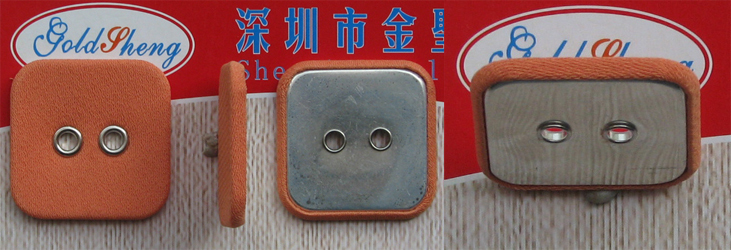 产品名称:方形布包鸡眼扣 别名(布包钮扣、包布纽扣、布包纽扣、包布钮扣、布包扣、包布扣、包布鸡眼扣、气眼纽、气眼扣),产品编号:B123,规格40L (25.5MM)- 60L (38MM),产品选用表面覆盖织物、铜鸡眼(鸡眼规格有7MM,颜色有无叻叻色、枪色、青古铜、仿金色等)、铝面或铜面、纽底(平面铝底)组合,表面覆盖织物可采用各种服装面料(各种图案印花或刺绣等,或用真皮,仿皮革)加工。