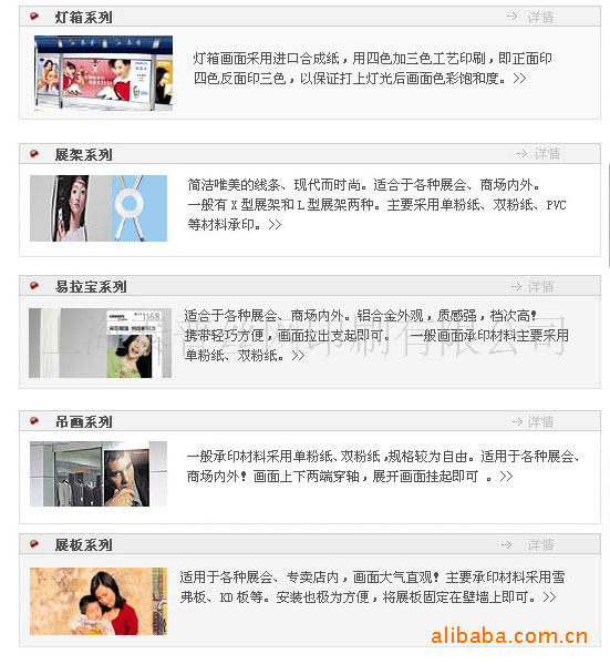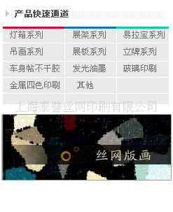 公司成立于一九九九年十月,是上海地区首家承印户外大型四色广告画的专业企业,现配有多种规格丝印机18台,包括进口大型自动丝网印刷机和烘炉.承印画面的最大规格1.8 X 4 m(不接驳),承印材料包括:合成纸,PVC片材,不干胶,静电膜,灯箱布,有机玻璃,KD板,雪弗板等,画面应用于灯箱广告,人像立牌,展架展板,易拉宝,标牌,以及装饰行业等领域.
