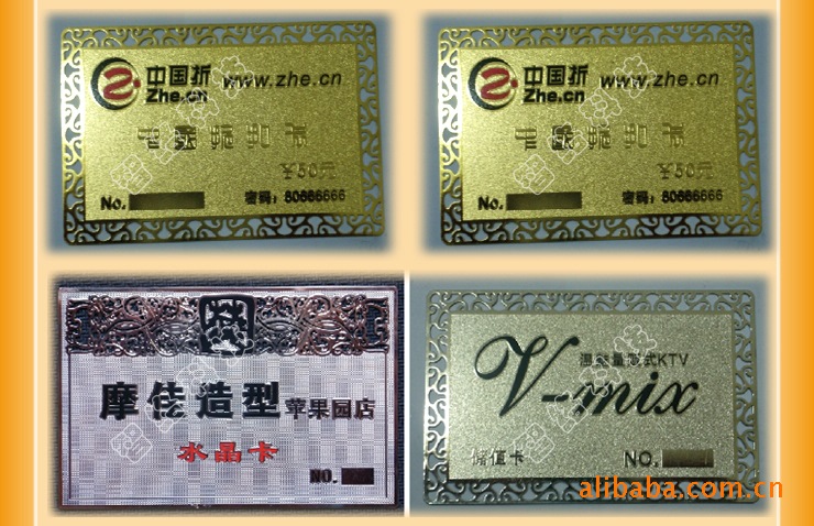 金属卡是薄铜片在被按照卡样显影后通过电解液蚀刻后电镀而成,部分金属卡还多 了一道着色或烫印工序。金属卡的原料以铜为主,部分高档金属卡的卡面镀有一定百分比的金或银,因此,金属卡在初期被称之为金卡或银卡。金属卡透着一种尊贵的气息,是贵宾的尊贵身份的象征或标识。
