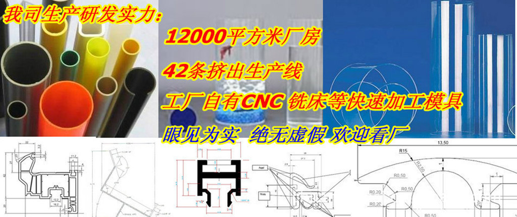 主营各式塑钢型材、管材(异型管、圆管、透明管、方管等)、胶条、双色共挤、软硬共挤、藤条、各种软硬度异型材以及模具开发,适用于家电、建材、家私、玩具、汽车、箱包等,产品质量稳定、价格合理、服务周到。产品通过欧洲SGS、ROHS检测,,提供一条龙服务----有模具部、胶粒制造、成型挤出加工部,可配合客户开发生产各种新产品,可开17%增值税发票。产品70%以上出口,欢迎您来人来电来样洽谈合作!