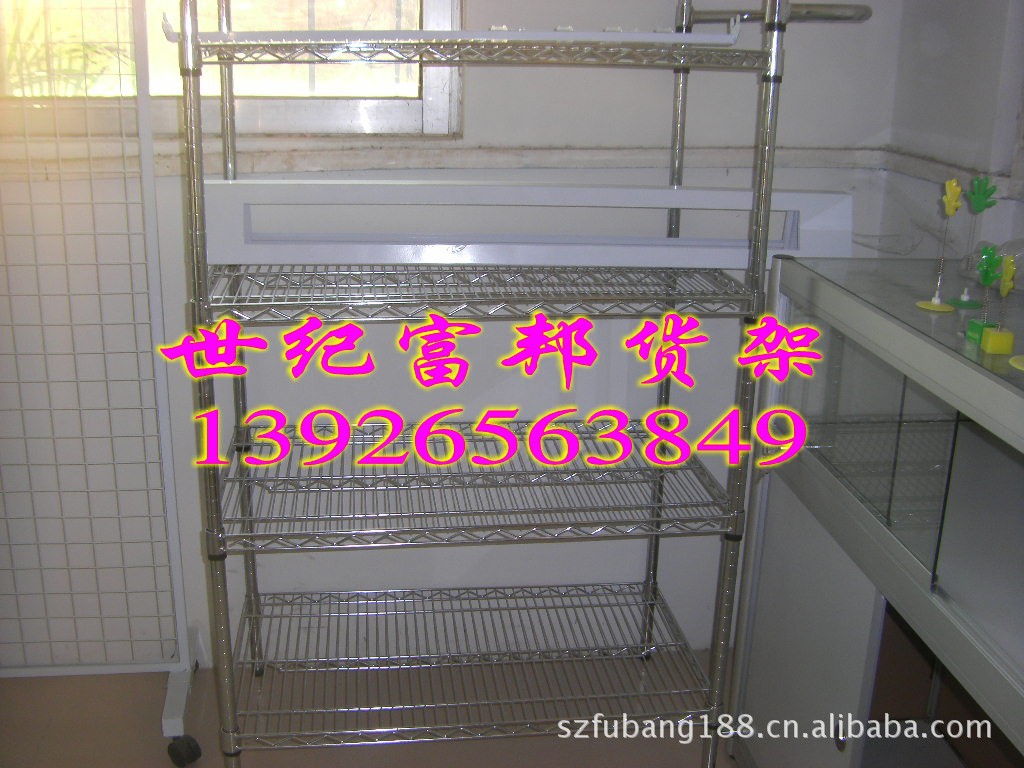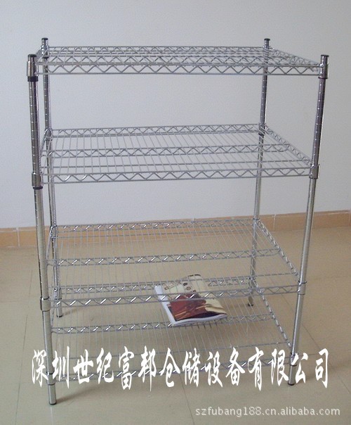 置物架特点(二) (1)结构独特:采用碳钢镀铬网片及支柱组合而成,其独特的造型结构,设计灵巧,装卸简便,洁净亮丽,坚固的碳钢镀铬网片能促进空气流通,减少尘埃积聚,开放式的设计,令储物一眼可见。 (2)灵活多变:支柱每一英寸有一沟圈,可随意调节网片高度(每英寸递增减)。可根据实际需要随意组合,可向左右随意延伸(同一宽度)或向前向后随意连接(同一长度)。加上各种配件,可组合成各种功能的产品,如加上V型钩、光身管,可组合成衣架;加上方向把手、轮子,可组合成餐车或推车;加上分隔片、侧片,可组合成书架等等。 (3)用途广泛:产品型号、规格非常齐全,可适合任何空间的需求,可以组成不同用途的系列产品,如厨房系列、客厅系列、卧室系列、书房办公室系列,以及商场、酒店、工厂或家用系列,产品展示架系列等。 (4)受力极大:微型系列每层网片可承载50KG,家用系列每层网片可承载100-250KG