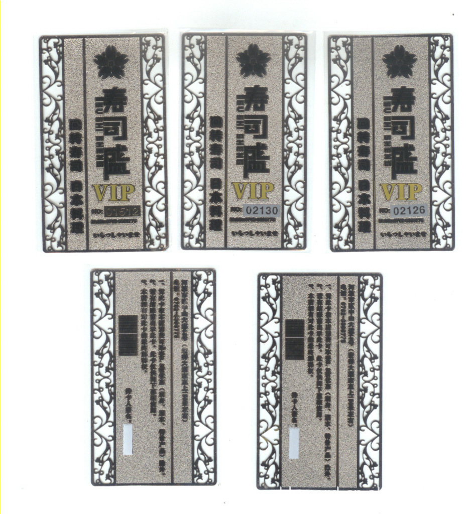 贵宾金卡、会员金卡、优惠金卡、名片金卡、佛像金卡等一系列产品,采用名贵金属材料及18K、24K真金表面加工,经多道传统工艺及现代化先进技术精制而成。融合现代设计思想,表现极度全国各地的银行、电信、邮政、服装、超市、教育、医疗、交通、旅游等领域风范。非凡的创意,高贵典雅,具有收藏、馈赠的价值。可用于商务赠品广告礼品等。此种金卡系选用高级进口铜材,经冲压、腐蚀、电镀、填漆等多工序精工制成。它具有独特的浮雕立体感和真金般的色彩,是制作高档贵宾卡、会员卡、纪念卡、年历卡的首选材料。欢迎全国各大宾馆、酒店、俱乐部向我公司订制。