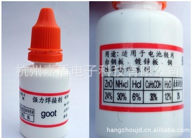 成份:ZnO 24% 、NH4cl 30%、Hcl 6%、C3H3COH 30%、H2O 12%、表面活性剂 3%
