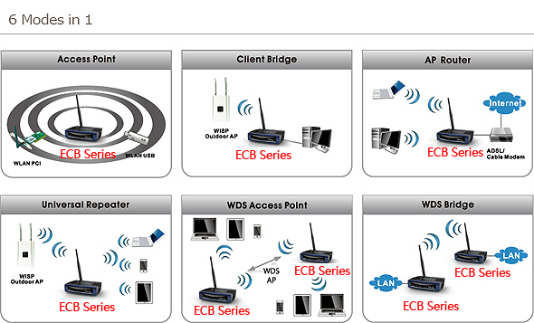 ECB150是一款多功能室内型无线AP/网桥,符合802.11n标准,支持1T1R空间数据流,可以提供高达150Mbps的接入速率;支持多SSID+VLAN功能,802.3af PoE供电,附带5dBi全向天线,适用于企业、酒店、餐厅以及高端家庭等场所的无线覆盖应用;ECB150具有6种不同的工作模式,可以实现不同的拓扑应用;