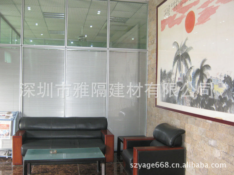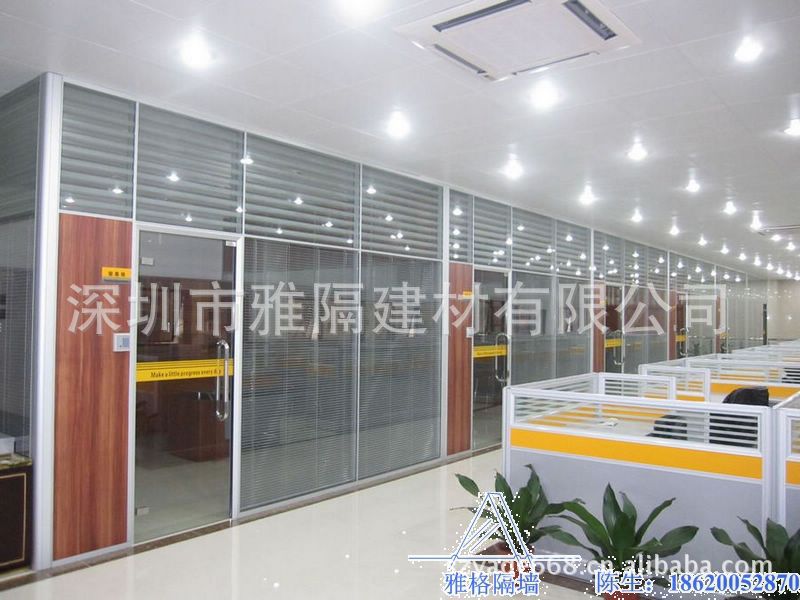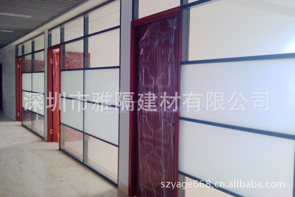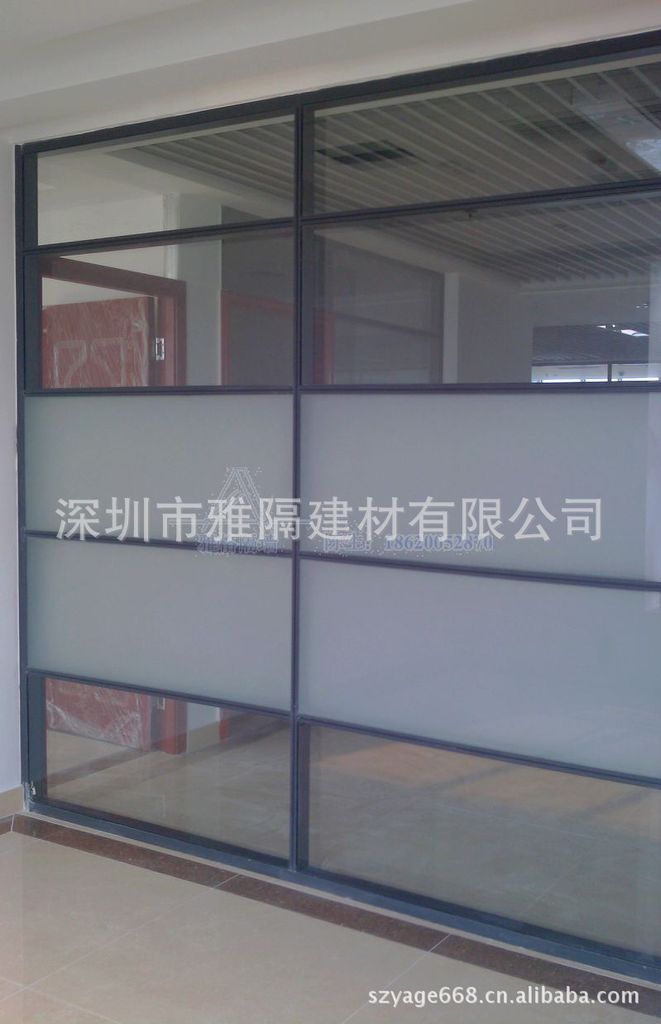 雅隔高隔墙系列产品常规是采用优质铝合金做为框架,专业设计的型材,具体款式有10-12厘单玻钢化的隔断产品,5+5厘钢化双玻中空加百叶的样式,用在办公室内或者是银行、机关、政府部门均可,隔音效果十分良好,系数在45dB左右,单玻隔断是到顶的一种隔断形式。