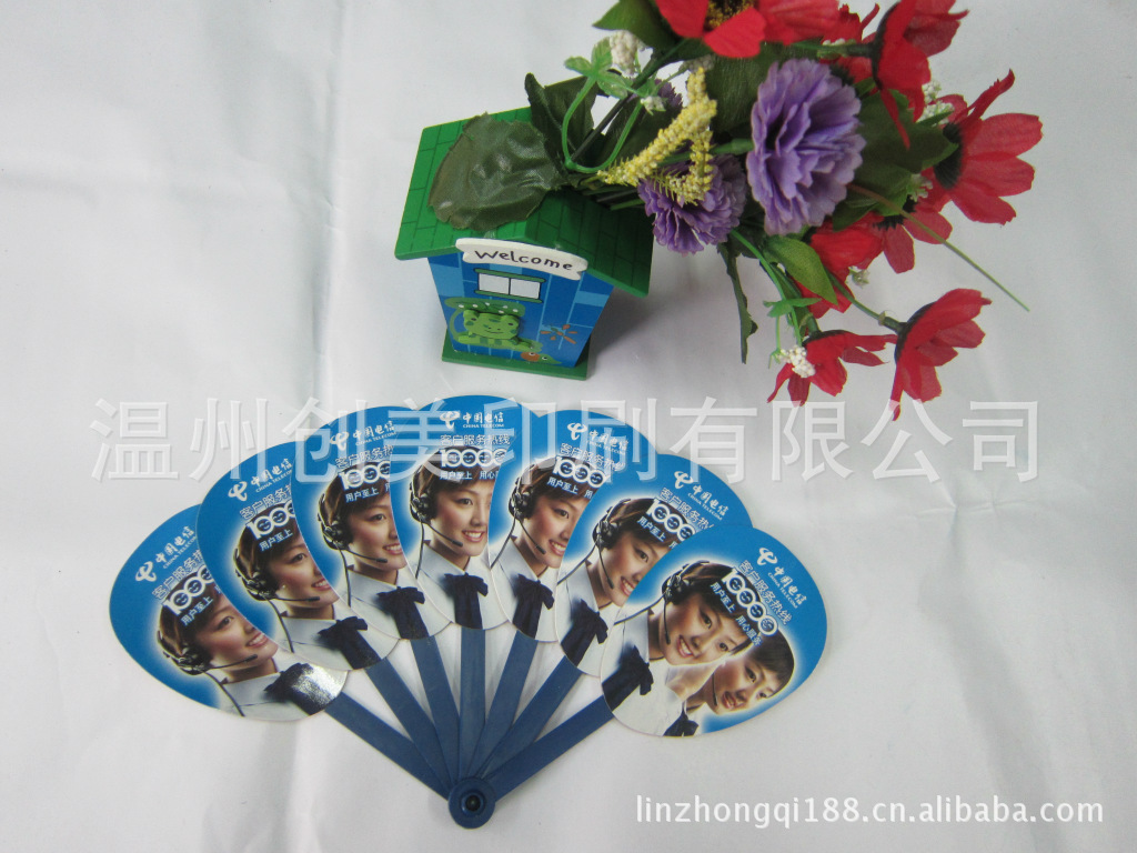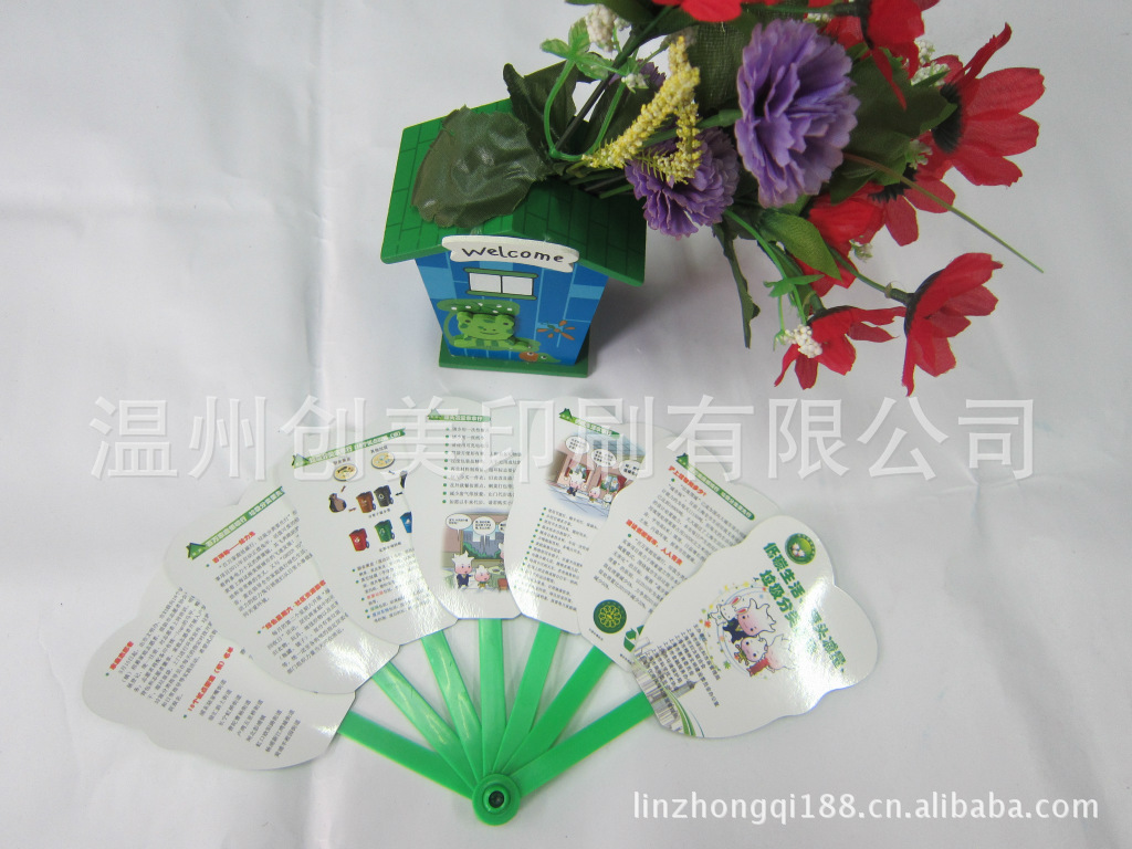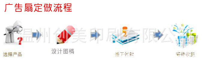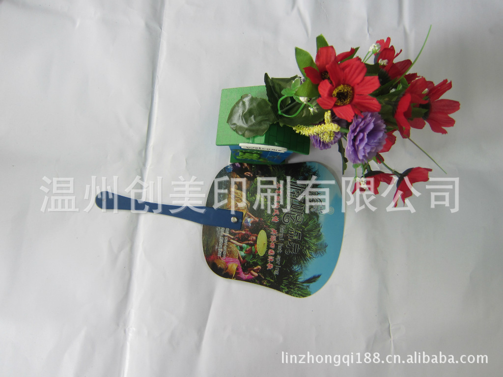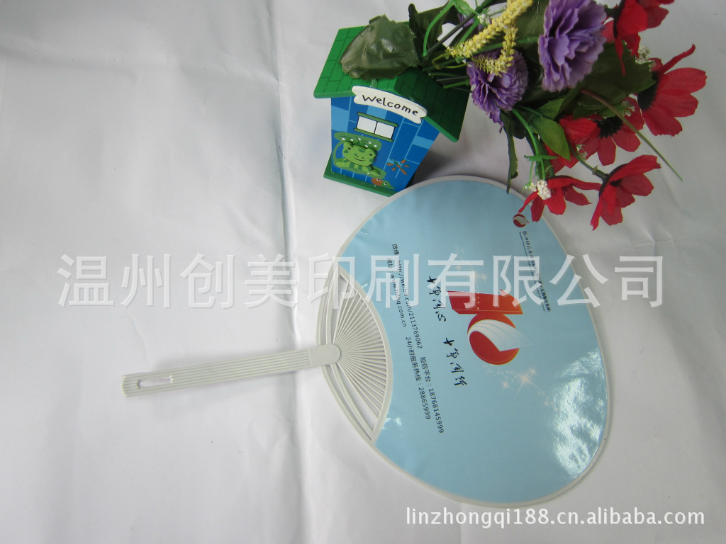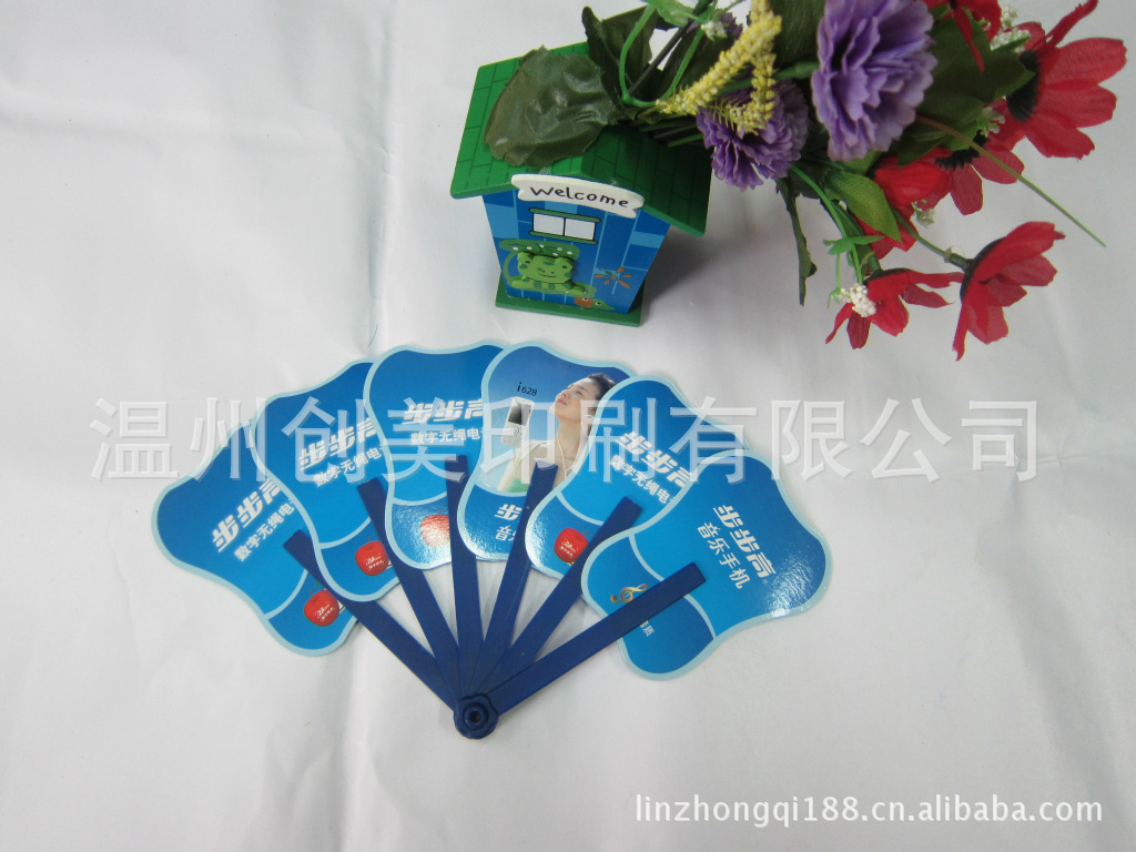 手柄颜色 : 手柄通用颜色:兰.绿.黄.红.白.黑:六种印刷: 双面四色UV印刷数量: 最低起定量5000把 (数量不同价格也不同)详细价格请索要报价单厚度 : 正常报价为60±2丝(可生产50-70丝)手柄外形: 中柄形 O形 1字 铆钉 7折 团扇扇面外形: 方形.圆形.半形.椭圆.异形(可定制各)扇面通用规格: 17*18cm 17*19 cm 18*18cm 19 *21cm(价格高8分)生产周期: 7天