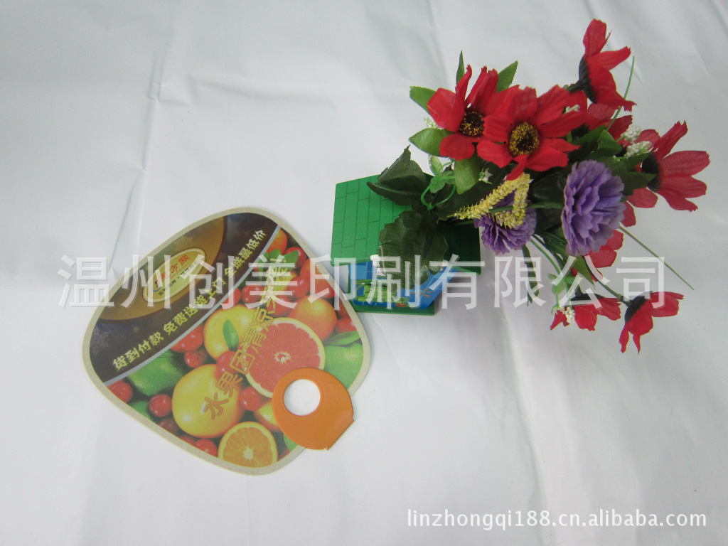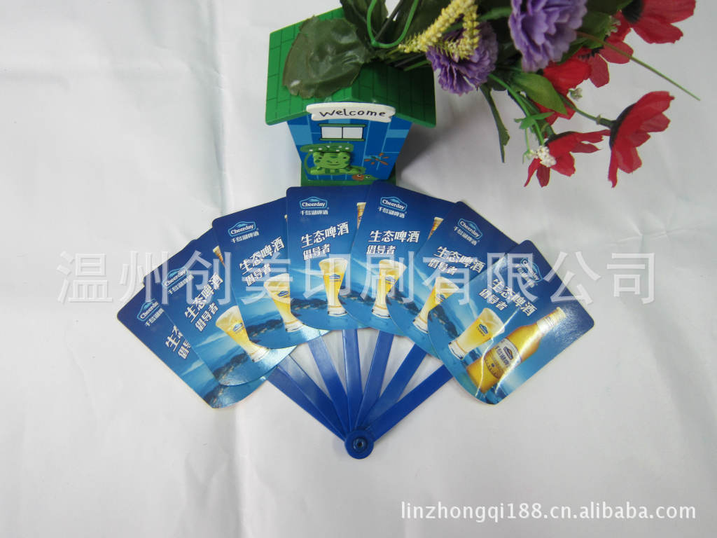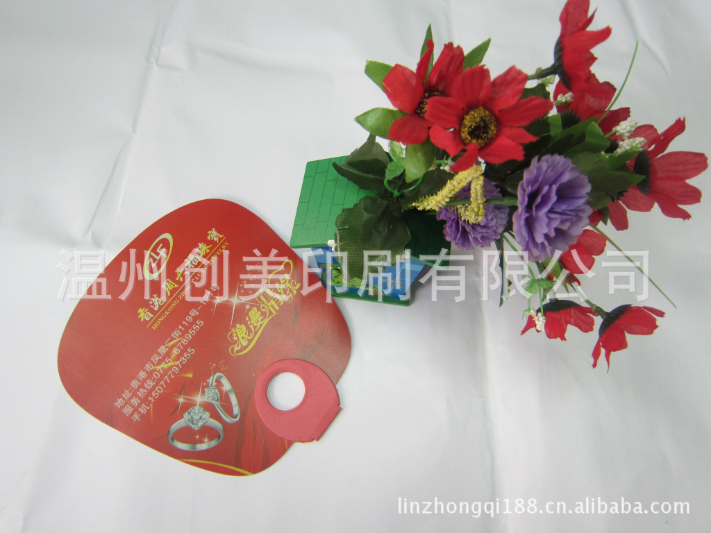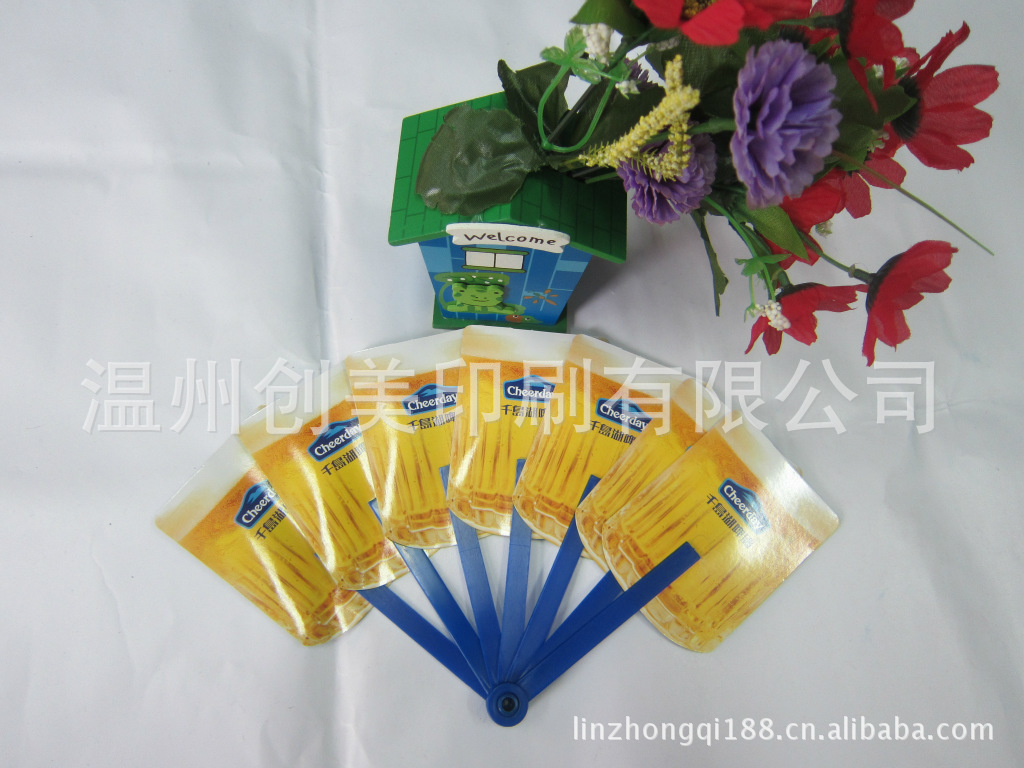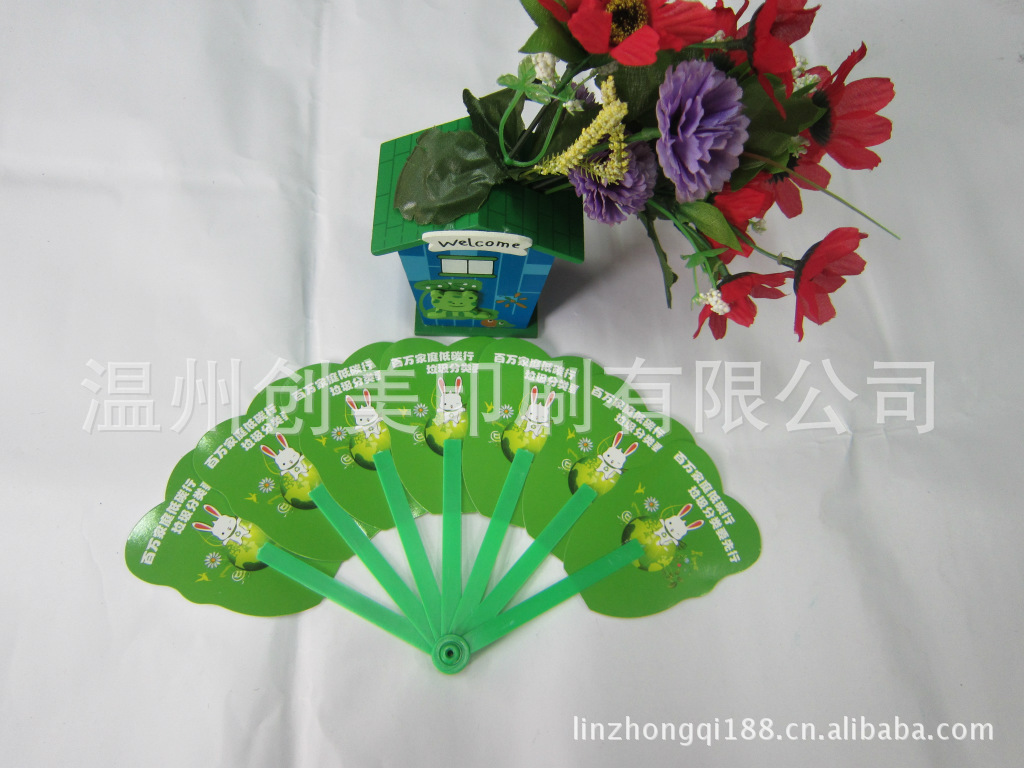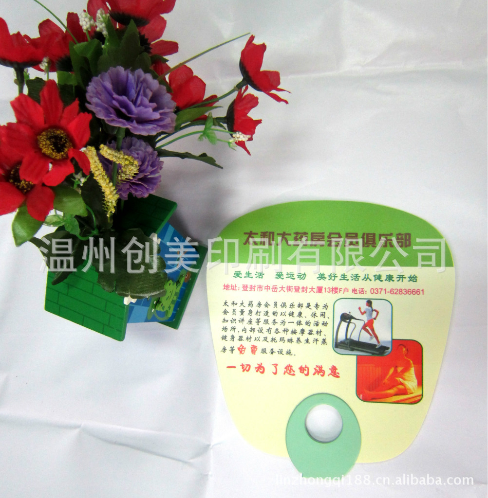 手柄颜色 : 手柄通用颜色:兰.绿.黄.红.白.黑:六种印刷: 双面四色UV印刷数量: 最低起定量5000把 (数量不同价格也不同)详细价格请索要报价单厚度 : 正常报价为60±2丝(可生产50-70丝)手柄外形: 中柄形 O形 1字 铆钉 7折 团扇扇面外形: 方形.圆形.半形.椭圆.异形(可定制各)扇面通用规格: 17*18cm 17*19 cm 18*18cm 19 *21cm(价格高8分)生产周期: 7天
