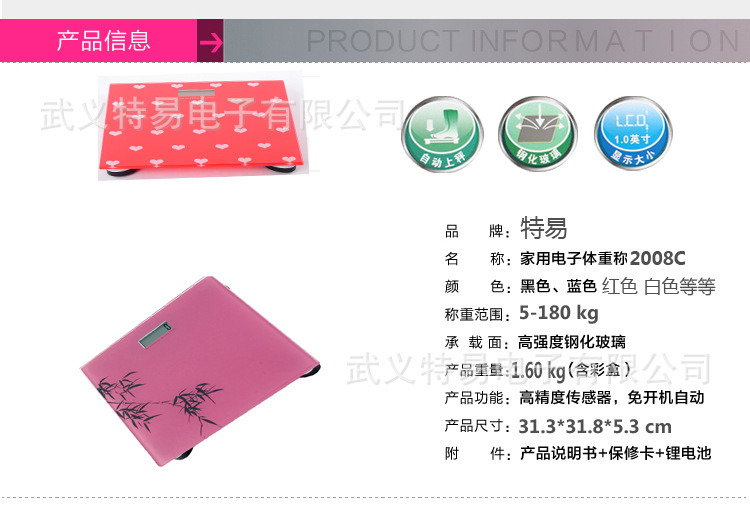 武义特易电子衡器有限公司是一家专业致力于生产销售各类电子人体秤,电子厨房秤,电子手提秤,机械体重秤,浴室秤,健康秤等衡器的现代化企业。