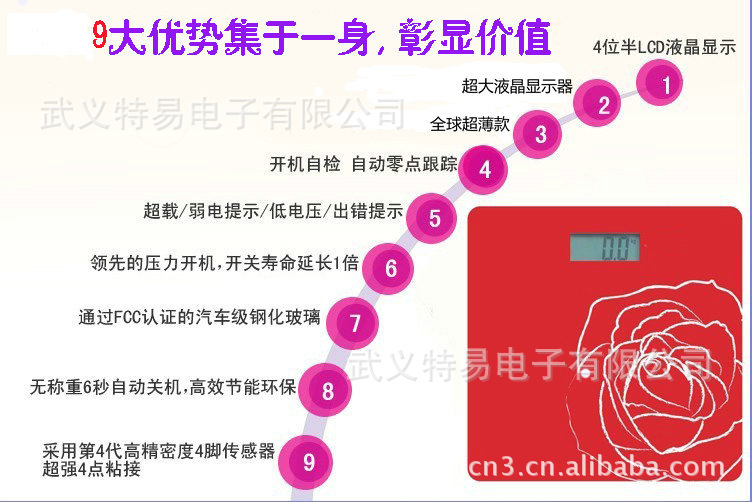 特殊的商业用途:您可以将贵单位的单位简介、产品信息、联系方式等商业信息印在秤体的玻璃表面上,可以作为健康时尚的礼品赠送给您的客户及作为福利发送给您的员工,这样,您的客户及您的员工可每时每刻看到您单位的商业信息,感受您实实在在的关心!