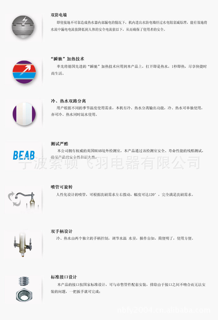 1、出、入水路双防电墙,结构上确保安全。