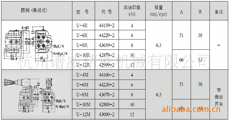 一组典型的U型分配器,通常可提供为4、6、8、10或12个润滑点的润滑。U型分配器仅有0.3ml/cyc一种规格的排量。注意对于分配器的出油口,不能堵塞任一出油口,而影响其正常工作,否则会损坏分配器。