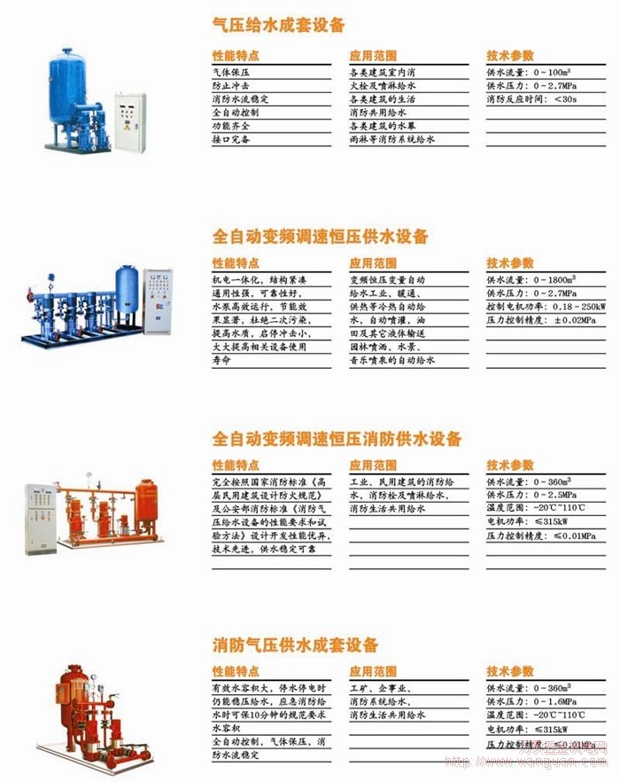 由于该设备工作特点的不同,自动给水设备可以分为两大 类,一类称为气压自动给水设备,另一类称为变频调速自动给水设备。它们各有特点,都属于无塔供水设备,已被广泛用于生活、生产、消防供水、水锤等许多领 域。 按照流量、扬程的需要,产品配备可以1-4台或更多的水泵并联运行。如果所配水泵仅一台称为基泵或主泵,其它称为辅泵。流量需求较小时,只开基 泵,流量需求大时,才开动一台或多台辅泵。