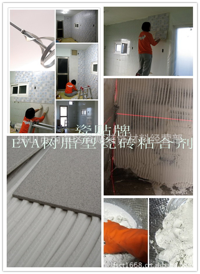 EVA树脂型瓷砖粘合剂母料勾兑水泥沙后,施工适用于:抛光砖湿贴粘墙,仿古砖湿贴粘墙,马赛克填缝粘合粘墙,人造石湿贴粘墙,大理石湿贴粘墙,沙岩砖湿贴粘墙等等,更多材质石类未能逐一列举。