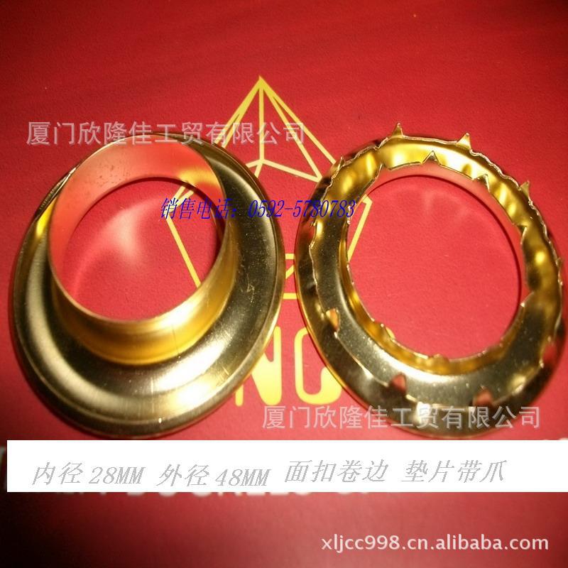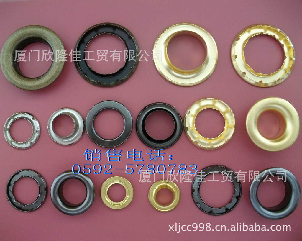 供应铜、铁质、不锈钢等带爪卷边鸡眼,又称帆布鸡眼,鸡眼外边卷边,垫片带爪。能够很有力的抓紧布料。本品比普通鸡眼容易定位,不会令布料走位或歪走。特别适用于汽车帆布帐篷订扣眼。用于拉绳等,起到很好的订位作用。用于织带的订扣眼,或用于纤维网订扣眼,帐篷拉绳和沙滩椅或是小孩子的推车穿管也能起到很好的作用。本产品深受国内外客户的欢迎,销量一直很好。卷边带爪鸡眼规格齐全。质量保证,更多信息请咨询我司销售人员。0592-5780783。欢迎来电咨询订购。