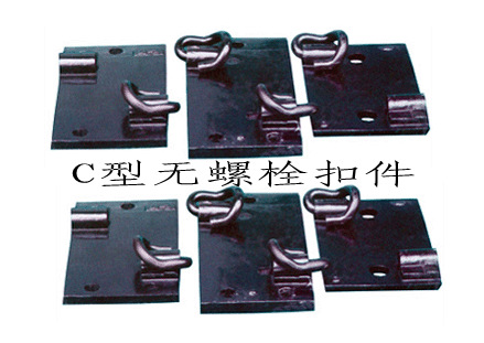 C型无螺栓扣件,主要由3部分组成铁垫板嵌式胶垫两个C型弹条,国家专利产品,质量好,价格合理C型无螺栓扣件,由C型弹条和优质可锻铸铁垫板组成。结构设计合理,零部件少,施工方便;扣压力平均达12.05KN,弹程为10.5mm,技术性能优于弹条I型扣件,不低于Ⅲ型扣件;用于一根轨枕上的抗爬行阻力为26KN,能完全防止铁路爬行,确保行车安全。由于不存在螺栓松动问题,从而大大减少了线路维修工作量及费用。该产品还具备防盗功能,优于国内各种弹条扣件。各项性能达到国内先进水平