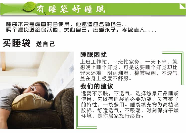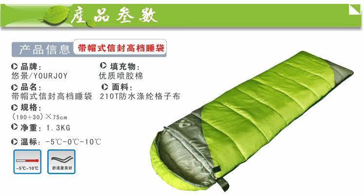 型号:YJ-S012品名:悠景新款信封带帽睡袋面料:210T防水涤纶格子布里料:210T春亚纺规格:190+30×75cm(应个人测量方法不同,会有一点误差,请理解)填充:优质喷胶棉颜色:绿色+灰色包装:210D牛津布压缩袋重量:1300克 温标:-5℃∽ -0℃ ∽ +10℃ 产品等级:一等品产地:中国·江苏市场价:RMB 198.00