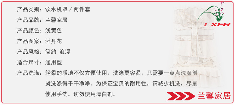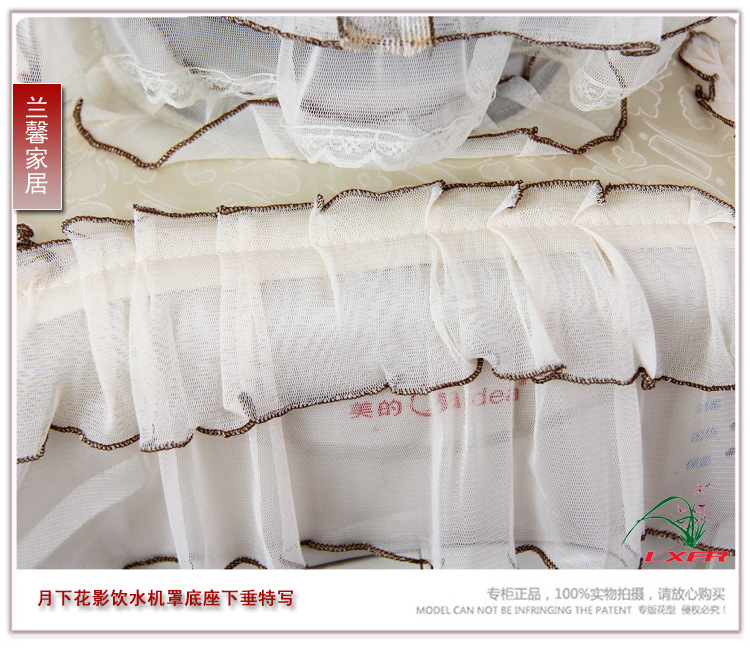 此款饮水机套做工很精美,漂亮的小花点缀,更给它增添了几多妩媚哦!它的色彩、质感和风格,谱写了一个会呼吸的灵动空间,让温情在淡淡丝语中浓浓展现。穿上它既可以有效的阻挡灰尘对饮水机的侵袭,还装点您温馨美丽的家。